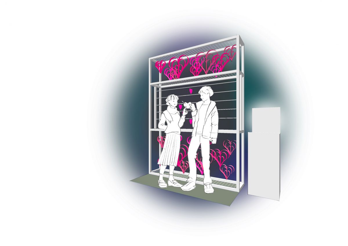 ここで記入したカードは、神社の絵馬さながら、みんなの思いが飾られたブースに「運命の赤い糸」で結びつけて神様にお願い。みんなの思いで作り上げられた、ハートがいっぱいのフォトスポットが完成していくので、ぜひ記念写真を。