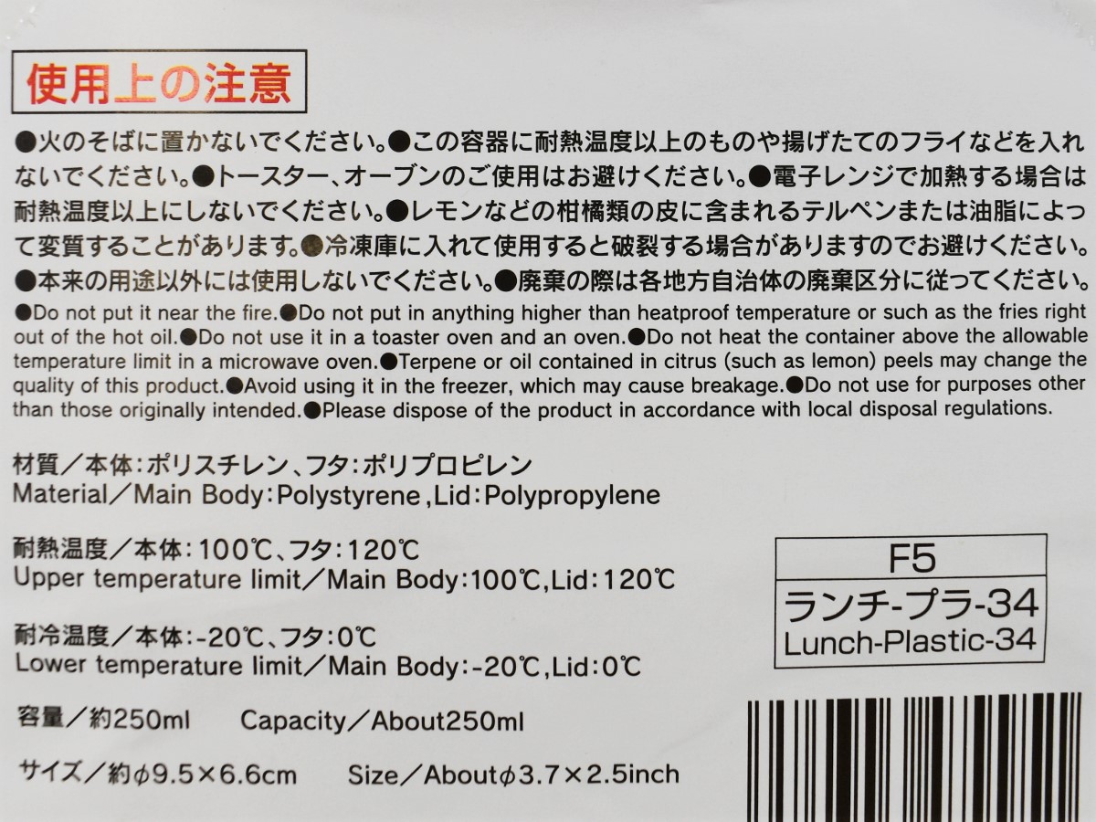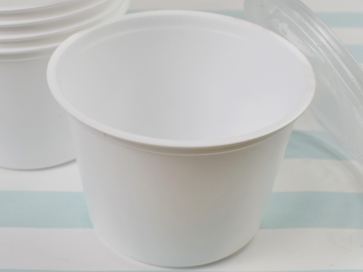 清潔感のあるホワイトカラーの同商品は、カップとフタがそれぞれ5つ封入されています。まずはカップからチェックすると、本体はポリスチレン製でツルツルとした触り心地。サイズは約9.5(直径)×6.6cm(高さ)、容量は250mlほどです。カップ本体の耐熱温度は約100度のため、一般的な電子レンジならチンしても問題なさそう。なおオーブンレンジでは使用できないので注意してください。