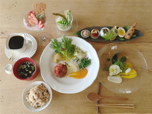 「自然循環」をテーマにしたレストランで、自家菜園で採れた野菜やオーガニックの食材などを中心に使った料理を提供。厳選された食材で作られたメニューの数々に、那須の味がたっぷりつまっています。シェフおまかせのランチコースは、前菜、主菜、玄米ご飯、味噌汁にデザートと飲み物というラインアップ。季節の香りや旬のうま味をじっくり味わいながら、贅沢なひとときを過ごすことができます。