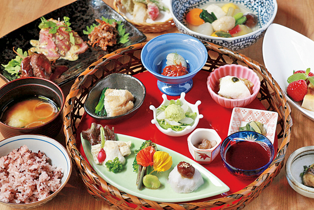 農園レストラン「清澄の里 粟」の姉妹店で、自家栽培の大和野菜やブランド牛の大和牛など、地元の食材を中心とした料理が特徴。多彩な食材を使った色とりどりのお料理が、目も舌も楽しませてくれます。旬の味が楽しめるのはもちろん、大和野菜の凝縮された甘みと旨味にはただただ感動!築140年ほどの古い町屋を改装した店の雰囲気もステキです。