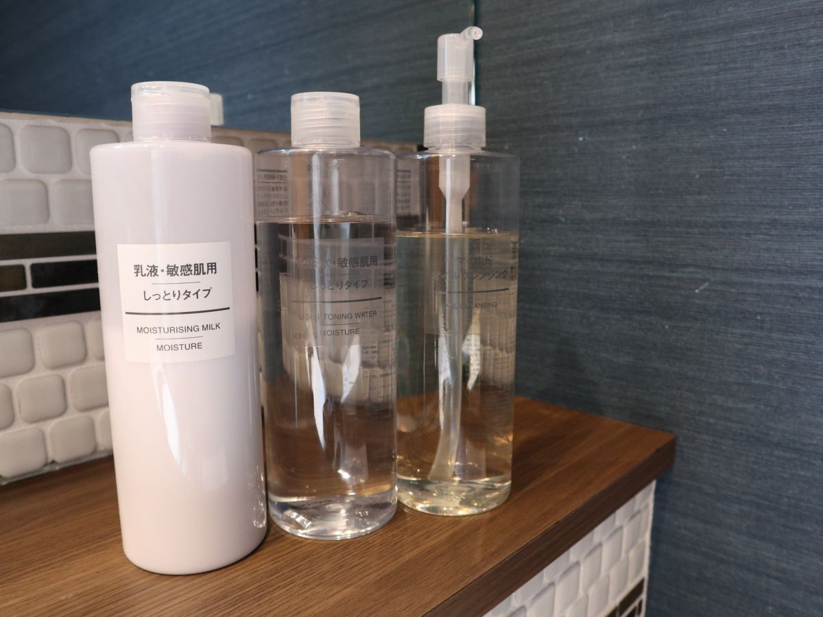 無印良品のスキンケアに、コテやヘアアイロンも自由に使えるのは、女性専用バスルームの特権。旅の荷物を減らしつつ、スタイリングもバッチリできるなんて嬉しいかぎりですね。