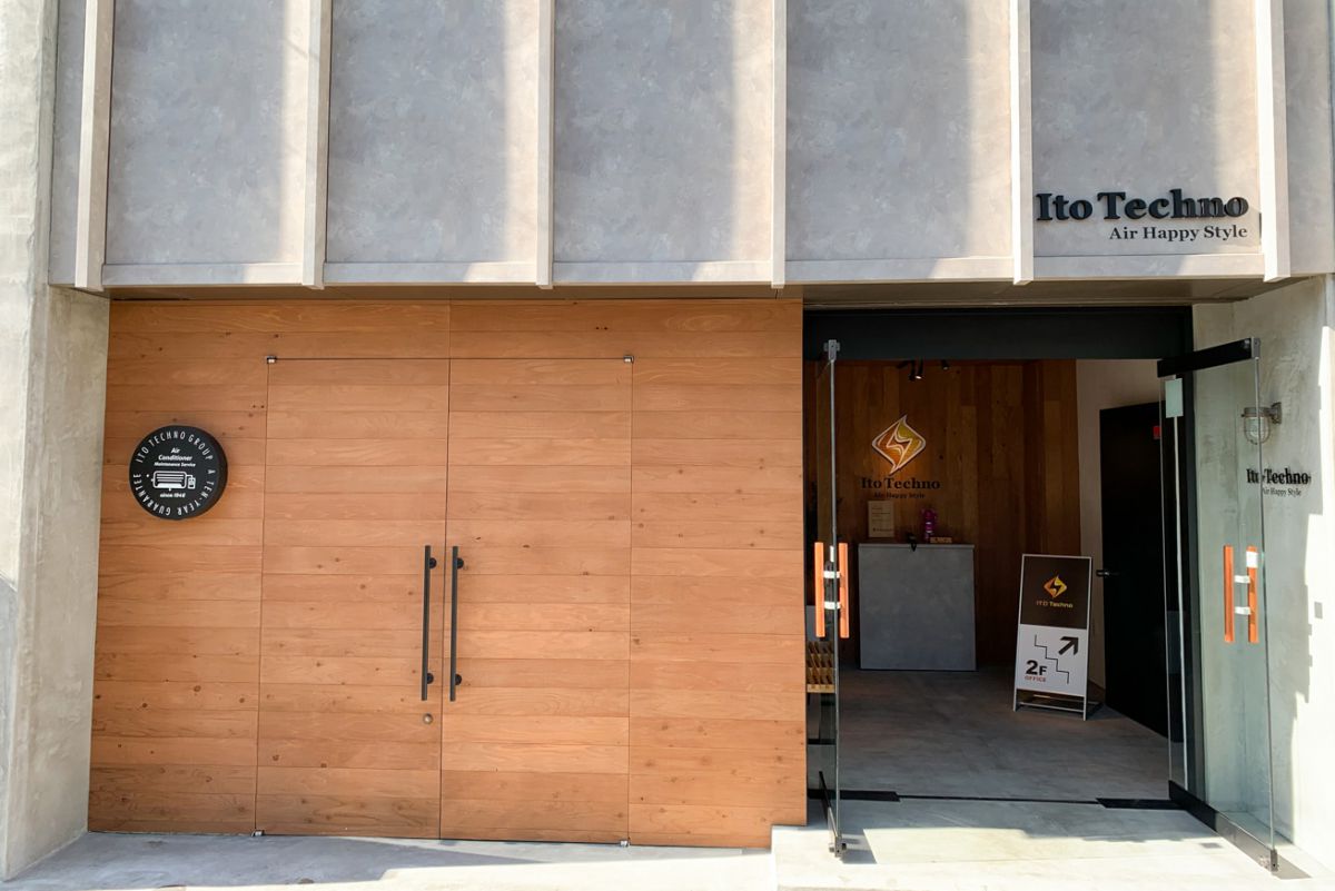 JR総武線新小岩駅北口の飲食店街を抜けたところにオープンした「いいオフィス新小岩 by ITO Techno」の入口は、シンプルかつシックなつくり。