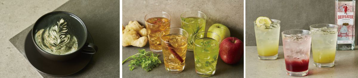 厳選した抹茶、煎茶、ほうじ茶などの本来の味を堪能できるメニューや、風味豊かな抹茶ラテはもちろん、抹茶×野菜ピュレ×植物乳の美しいコンビネーションを表現した「フローズンベジ抹茶スムージー」900円や、抹茶とヴィネガーを合わせた「抹茶フルーツ酢ムージー」850円、日本茶にハーブやフルーツを合わせた「フレーバー日本茶」520~580円などが揃います。