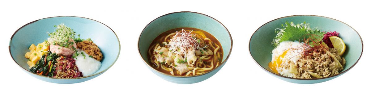 このほか、「ねばねばネギトロどんぶり(左)」950円、「茶美豚の薬膳カレーうどん(中)」880円、「大葉と筍のそぼろどんぶり(右)」880円など、うどんやどんぶりメニューもあります。