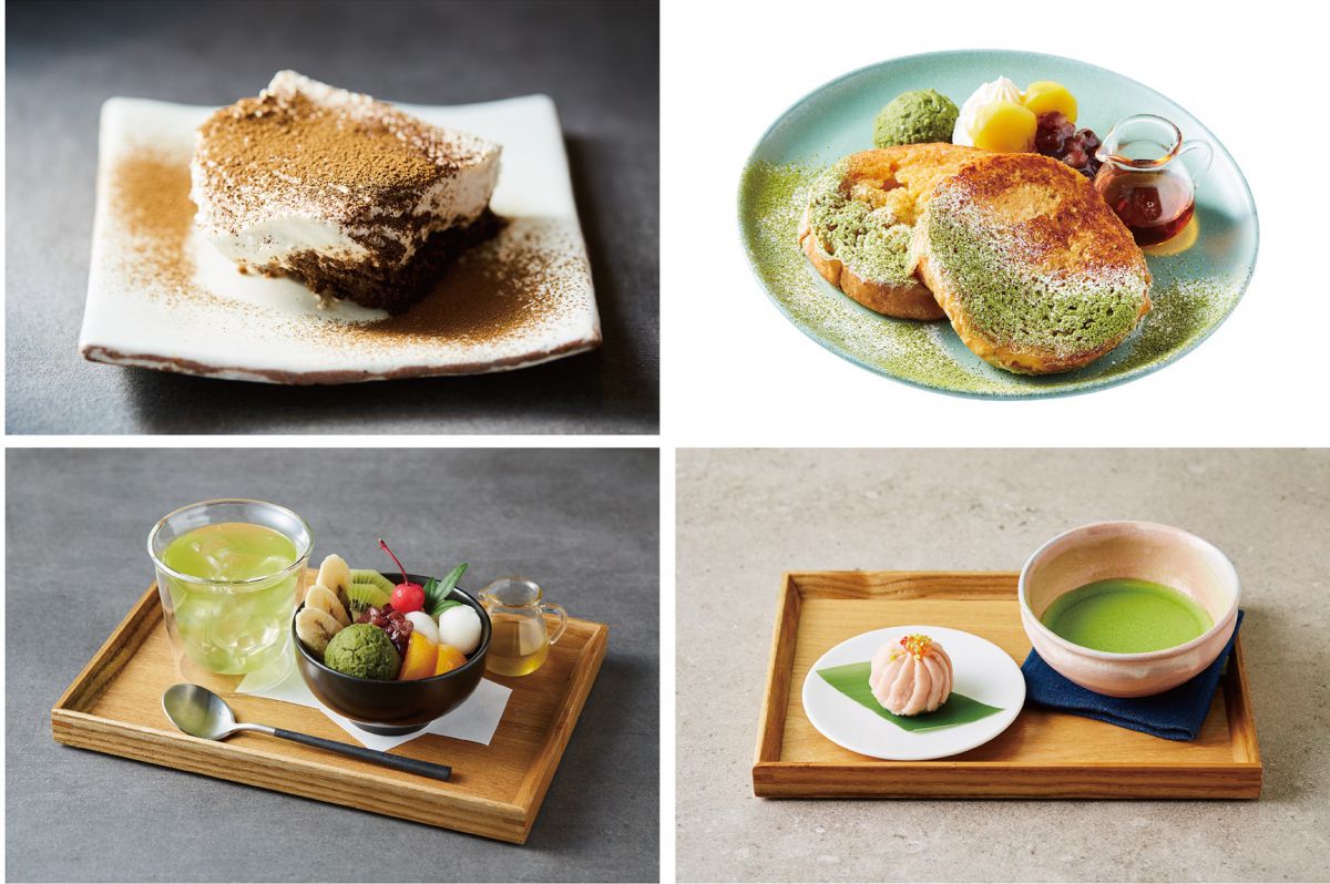 このほか、「豆乳ほうじ茶ティラミス」(左上)700円、「あんみつ(抹茶アイス・ほうじ茶アイス)」(左下)600~720円、「ブリュレフレンチトースト(抹茶・ほうじ茶・メイプルナッツ)」(右上)800~900円、「COHAGIとお抹茶(紫芋・苺)」(右下)650円、「抹茶ブラウニー」720円など、お茶を活かしたスイーツが楽しめます。