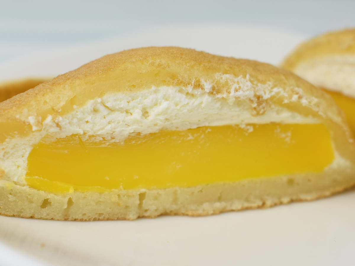 中身はいっぱいに詰まっているため、最初のひとくちでホイップクリームとプリンも味わえます。「ホイップクリーム+プリン」という重たそうな組み合わせとは思えない、意外なほどの軽やかさ。甘さひかえめのプリンは普通よりもタマゴ感が強く、むっちりと密度を感じます。もちもちでやさしい甘みの生地と、つるんとしたプリンの濃い味わいは相性抜群。