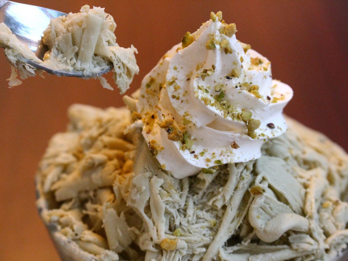 見た目はかき氷のようですが、実はアイスクリームを削ったシェイブアイス。氷を削った一般的なシェイブアイスとは違う食感にびっくりです。羽毛をすくっているような軽やかな感触、口に入れると濃厚なピスタチオの味が広がって、一瞬にして舌の上で溶けていきます。