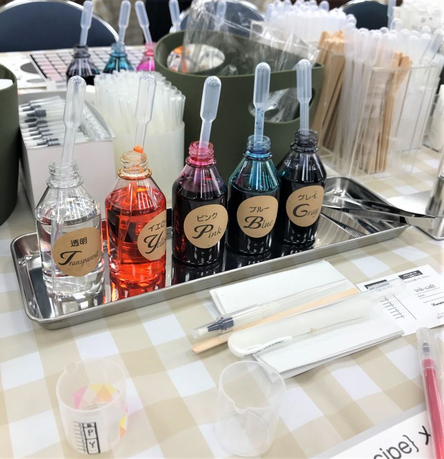 こちらは呉竹(ブース番号:107)のink‐café1800円。84色ものカラーチャートからお気に入りの色を選んで、自分でインクを作れちゃうワークショップ。筆ペンもしくは細ペンにインクをいれて完成。お気に入りカラーインクでペンが作れる空き容器「からっぽペン」付き。約15分で体験できます。