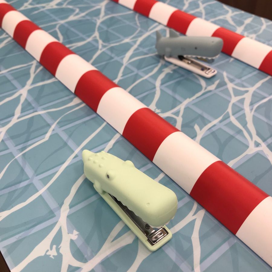 動物型のホッチキスが競泳中!? デザインはワニとサメ、ビーバーの3種類あります。こちらの商品はまだ未発売。一般販売も期間限定なので、文具女子博でフラゲしちゃいましょ。