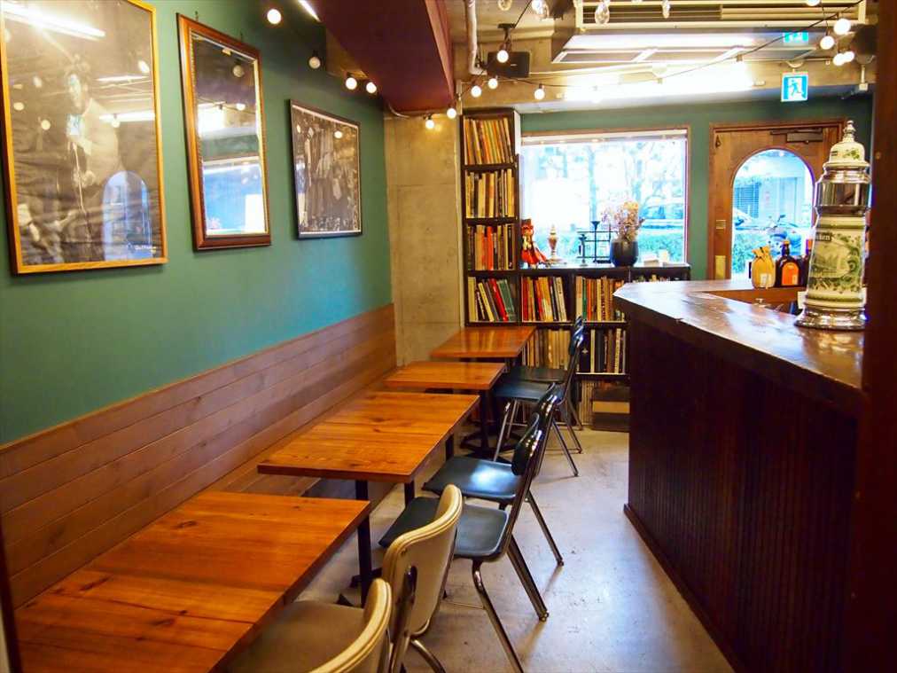 店主は元グラフィックデザイナー。ウッディーなインテリアやグリーンをアクセントにした落ち着きのあるステキな内装には、その美的センスが光ります。壁にはモノクロのアーティスト写真、棚には写真集やアートブック、CDジャケットなど、店主の趣向を感じさせるものがぎっしりと並べられています。