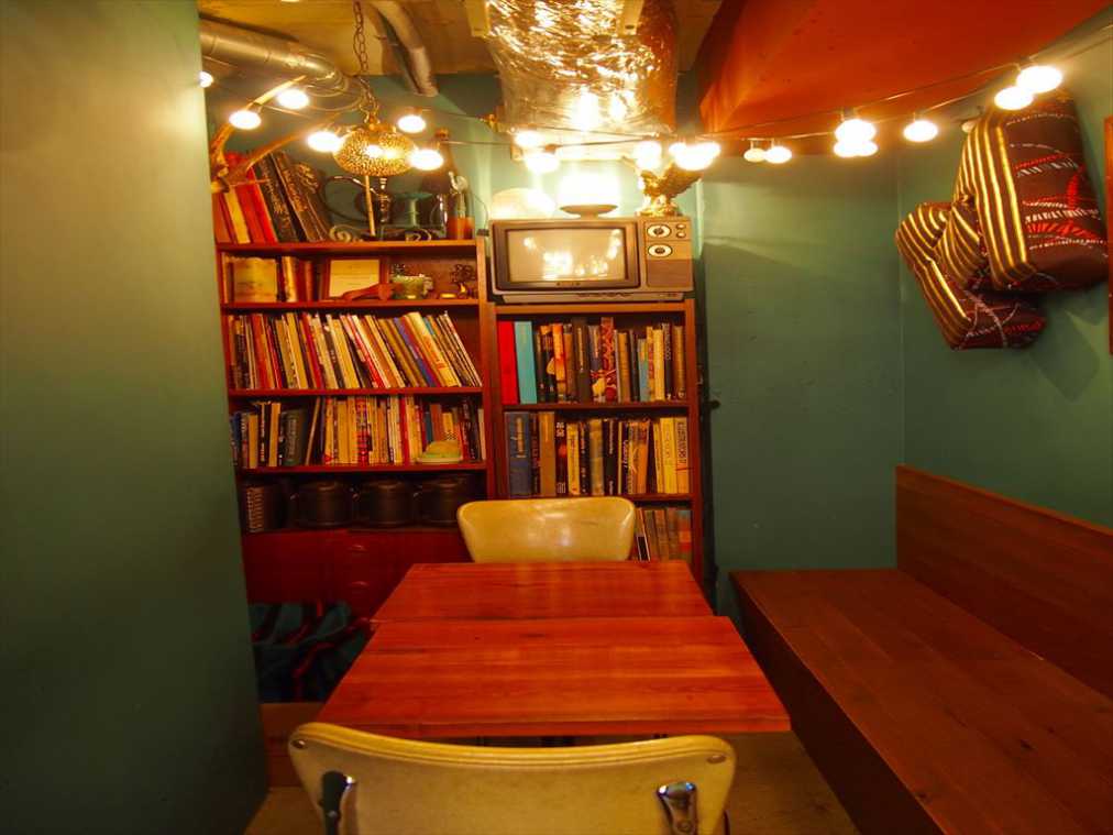 グループでもゆったり過ごせる個室風スペースも。少し奥まったところにある、照明の明るさを抑えた空間には、レトロデザインのグッズやアートブックなどステキなコレクションが飾られ、まるで“大人の秘密基地”のよう。