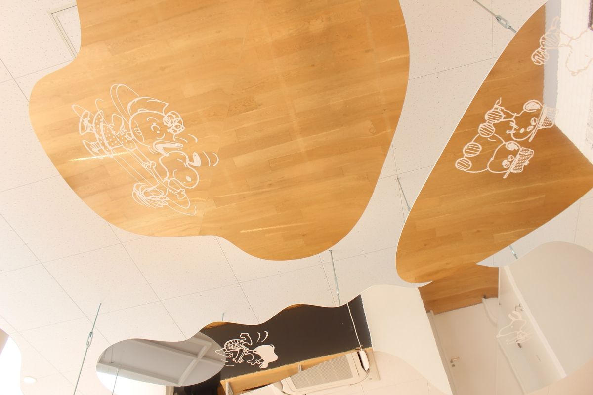 館内に入ったらまずは頭上に注目。鏡になっている雲の上からスヌーピーたちが出迎えてくれていような仕掛けです。