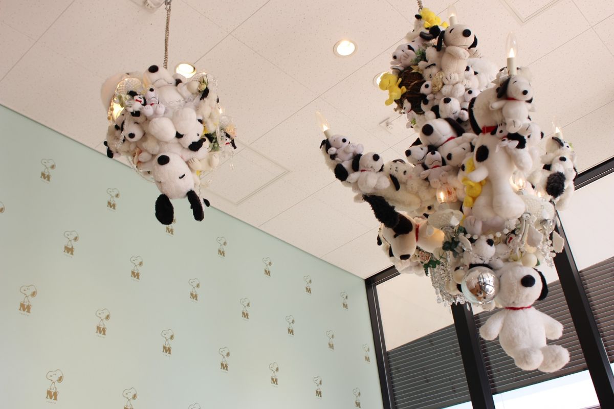 入り口横にはスヌーピーでいっぱいのシャンデリアも!耳が下に垂れ下がっているのがかわいすぎる…。