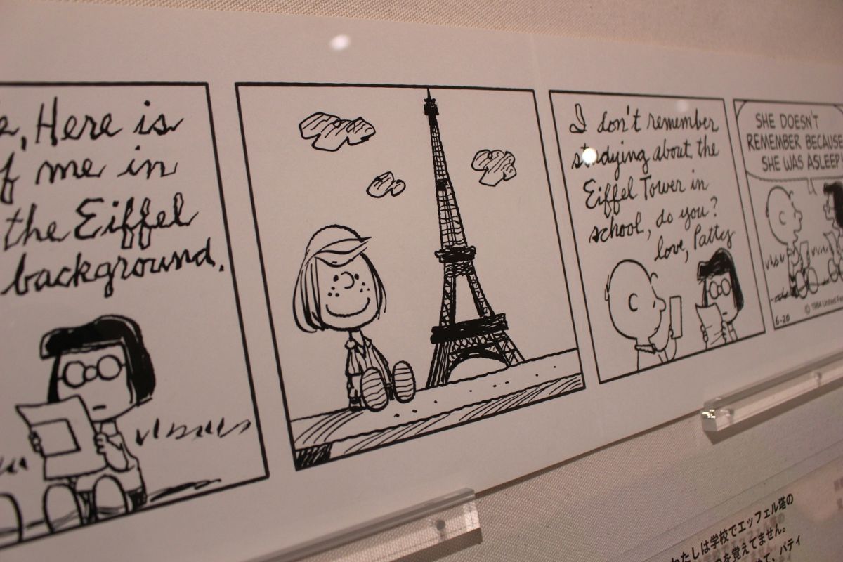 例えばこちらは、フランスのエッフェル塔を訪れた際の1コマ。新聞のコミックという小ささでも伝わるよう、最小限の線でエッフェル塔が描かれています。世界各地を巡る「ピーナッツ・ギャング」をじっくり眺めてみてくださいね。