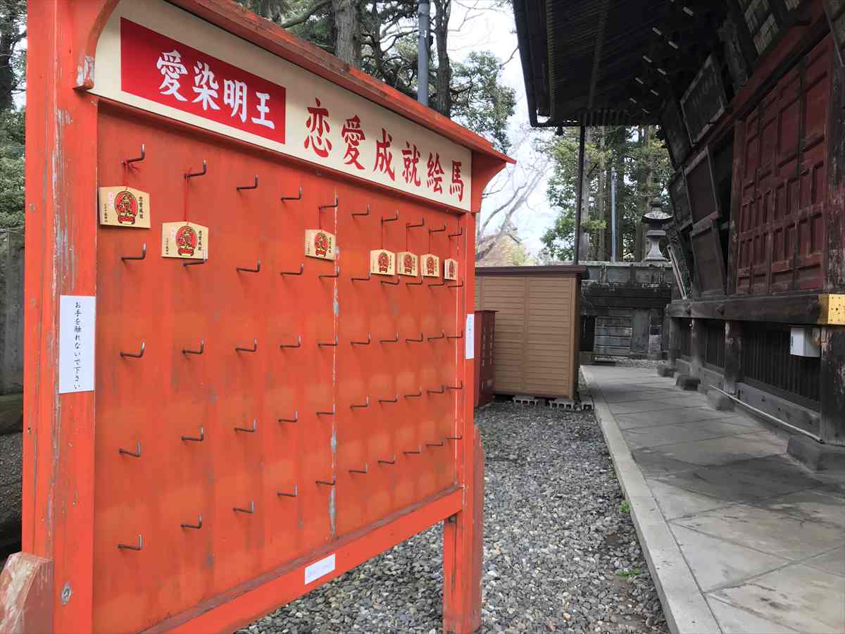 愛染明王が描かれた絵馬の裏面に願い事を書いて、表にして絵馬掛けにかけます。
