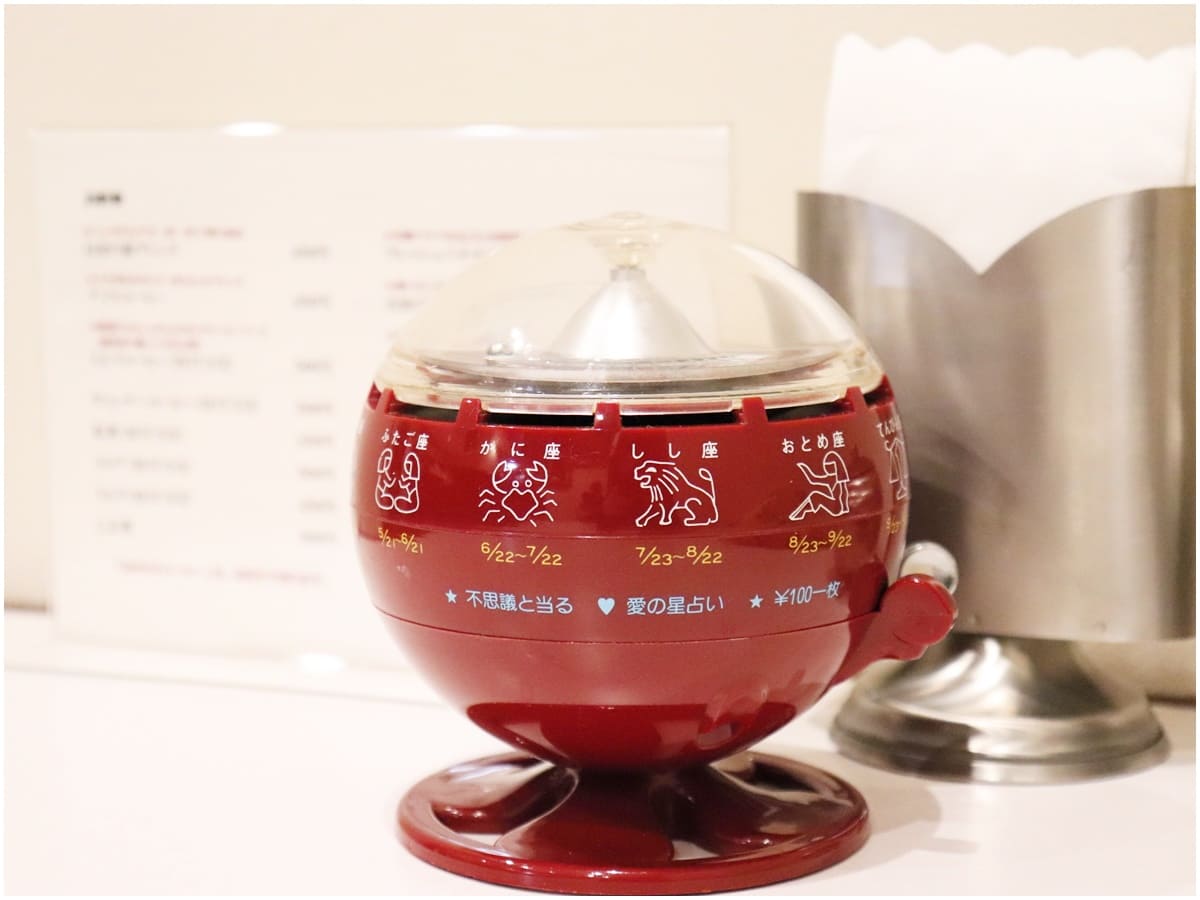 そしてテーブルには、これぞ“昭和の喫茶店”ともいうべき占いマシーンが。有楽町の本店にもあるそうですよ。ここまで再現しているなんて感動!