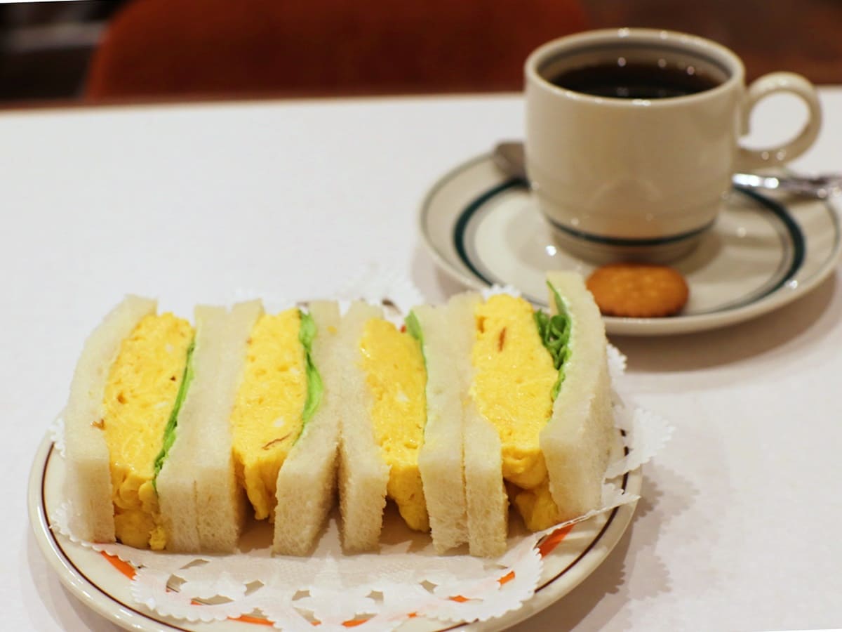 「玉子・サンドゥイッチ」は、注文を受けてから焼き上げる厚焼き玉子のサンドゥイッチ。この厚みがうれしい!