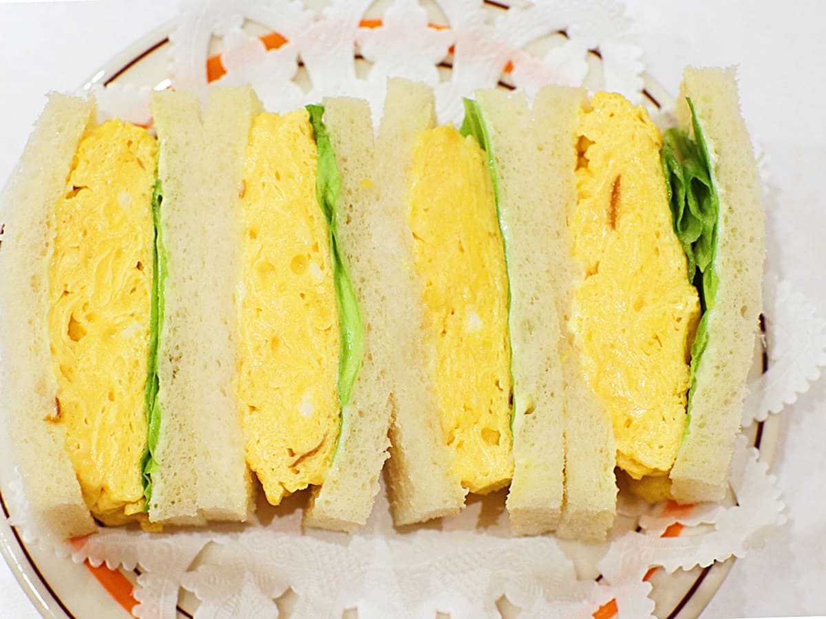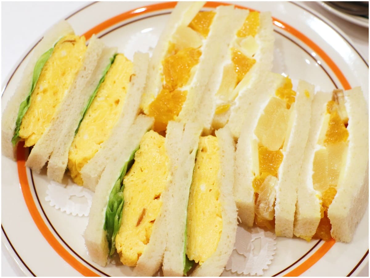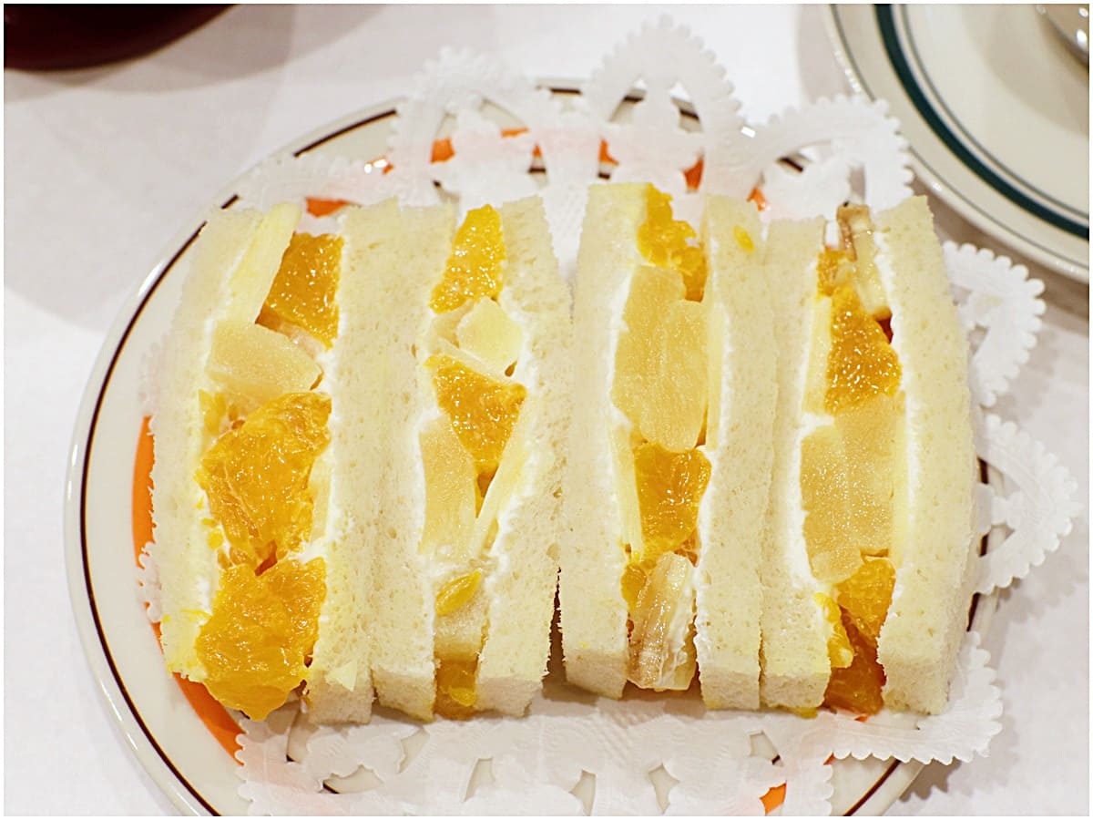 写真は「玉子・サンドゥイッチ」と「フルーツ・サンドゥイッチ」のハーフ&ハーフ。