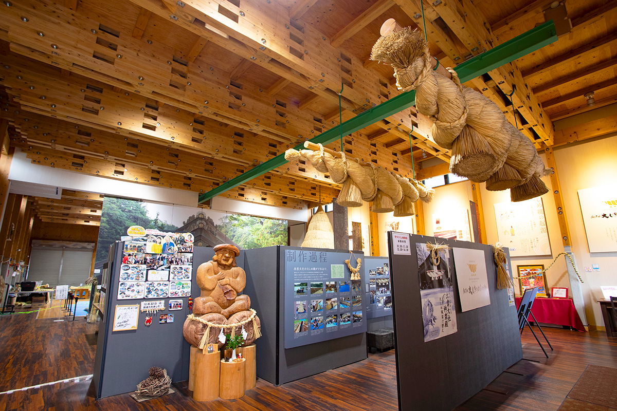出雲大社神楽殿に飾られる、長さ13.6m、重さ5.2tの大しめ縄。飯南町では古くから、その日本最大級の大しめ縄を作り不定期に奉納しています。しめ縄専用の稲を育てるところから、手作業で縄を編み、最後はクレーンを使って巻き上げるところまで、実際の作業の様子や、資料を見ることができます。