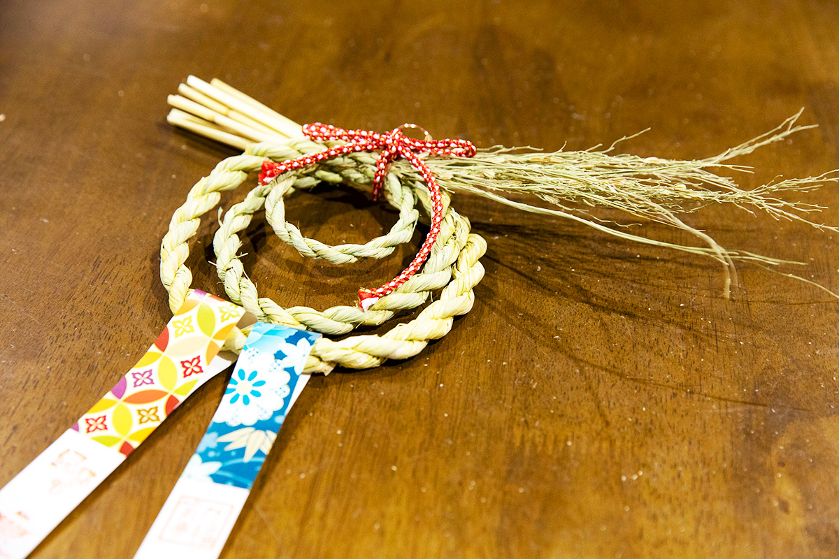 ここではしめ縄作りを体験することも可能です。今回は、30~40分ほどで小型のしめ縄が完成する初級コース(980円)にチャレンジ。わらをより合わせていくのは、意外と力が必要ですが、疲れたら先生が手伝ってくれるのでご心配なく。直径10cmくらいの「輪じめ」を作り、お好みの短冊を取り付けて完成です。