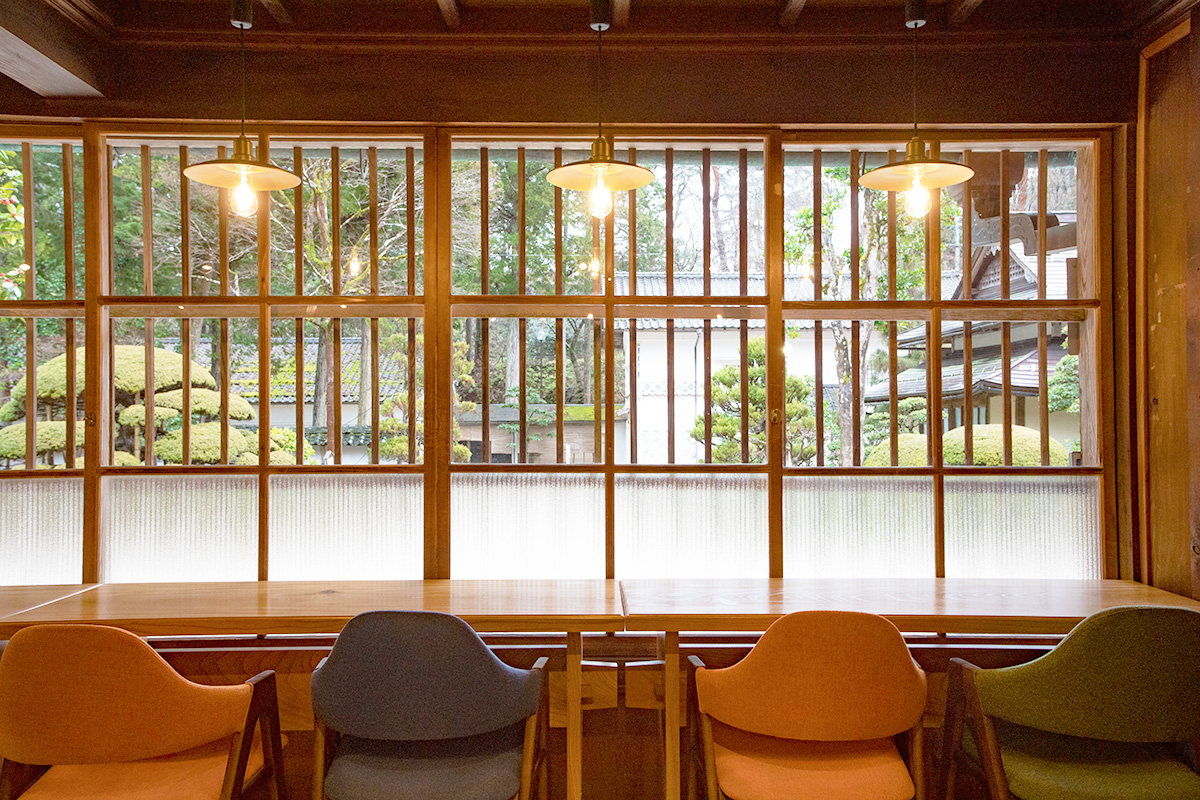 1924年に建築され、現在も15代当主が暮らす「絲原家居宅」は国登録有形文化財。この住宅の一角に喫茶スペース「茶房十五代」があります。大正時代の雰囲気が残る店内には、レトロなランプや古時計が趣を添え、机には絲原家の山林から伐採したケヤキが使われています。