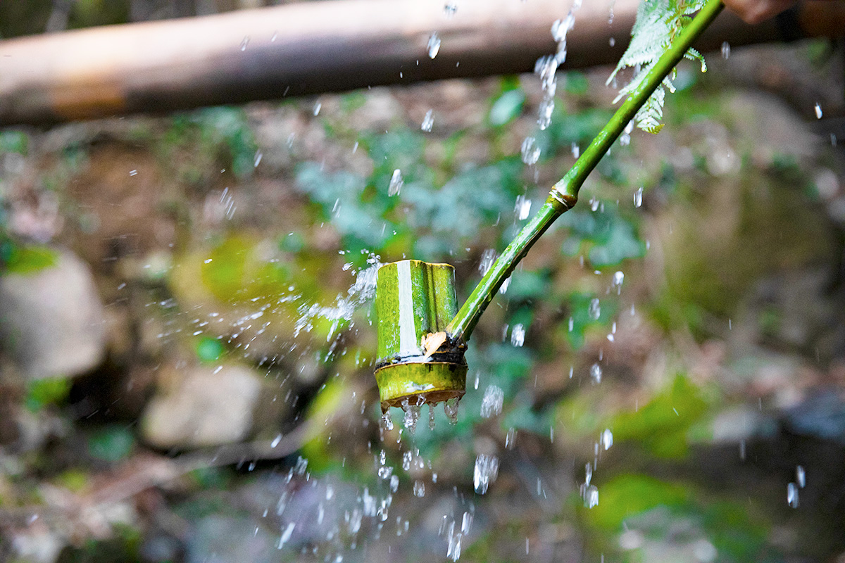 奥宮への参道の途中にはお清めの湧き水「神泉坂根水」があるので、この水で身を清めてから参拝しましょう。看板には「不老長寿」の文字も。