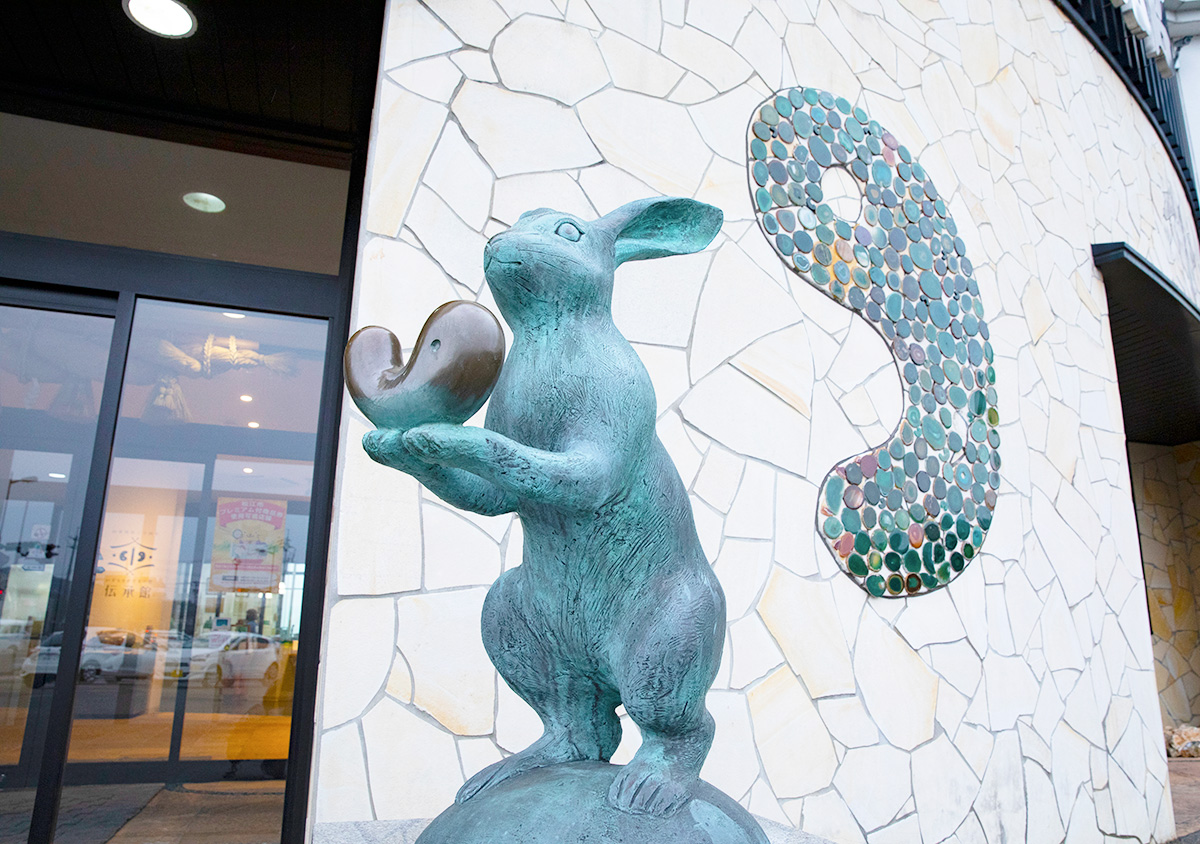 最後の目的地は宍道湖のほとりに佇む「いずもまがたまの里伝承館」。斐川ICから再び山陰自動車道で松江玉造ICに戻ります。ICを降りると5分ほどで到着。入り口では勾玉を抱えたウサギのオブジェが迎えてくれます。