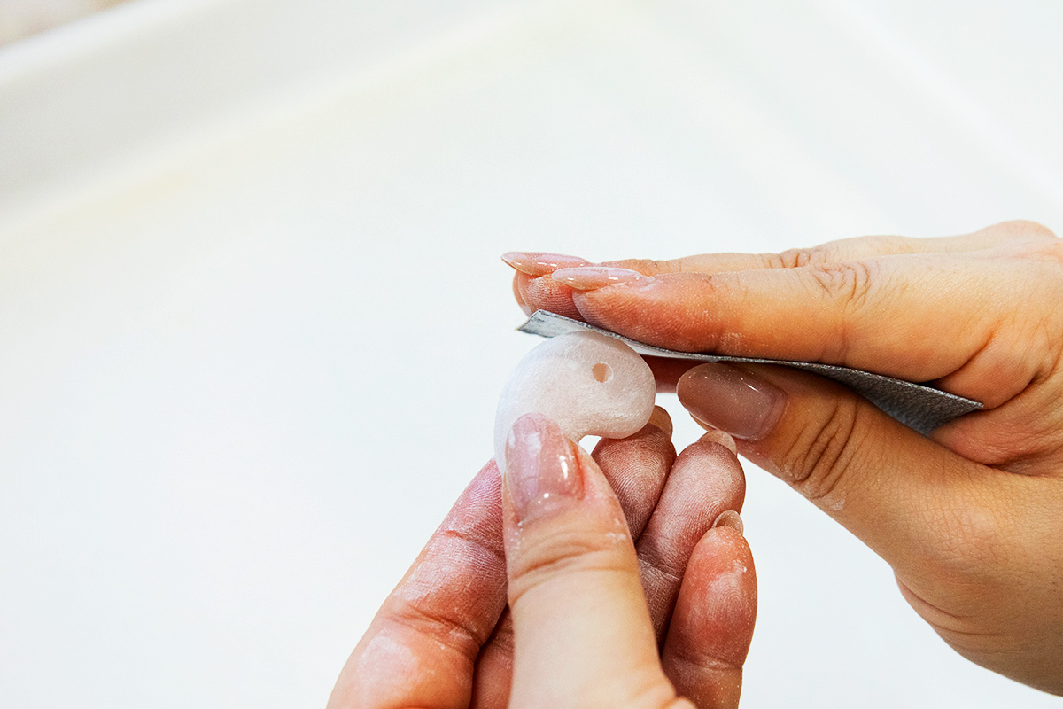 なかでも気になるのは、職人さんに直接指導してもらえる勾玉づくり体験。ある程度、形が整えられた勾玉を磨き上げる30分のコースと、でこぼこの石を自分で整えるところから始める60分のコースがあります。紙やすりを使って勾玉の表面を整えていくのですが、気づけば無心になって石を磨いていました。