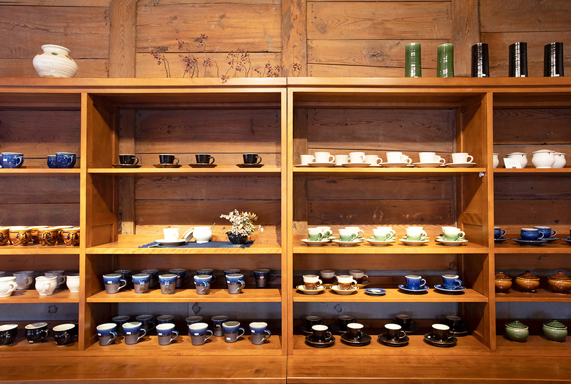 出西窯は戦後に5人の青年が立ち上げた窯元で、柳宗悦やバーナード・リーチらとの出会いによって進化。民藝品を「見て・買って・使える場所を」と、くらしのVillageが誕生しました。「くらしの陶・無自性館」で気に入った器を購入できるほか、工房内で職人さんが作業している様子や、登り窯に火が入っている様子も見学できます。