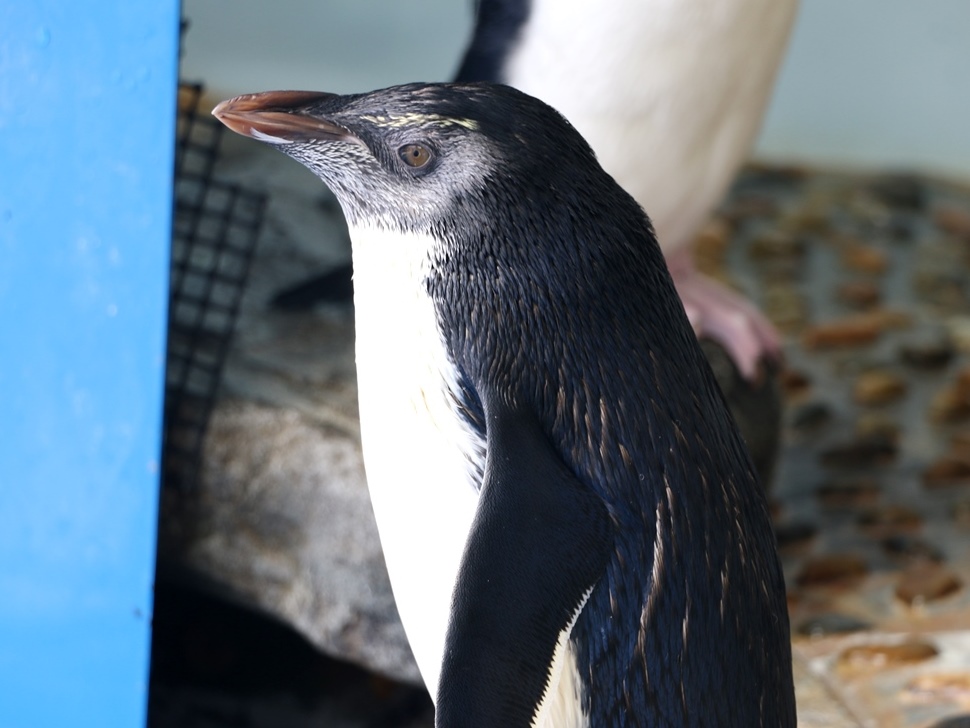目の後ろで大きく広がる黄色い飾り羽が特徴の「イワトビペンギン」の「はく」。