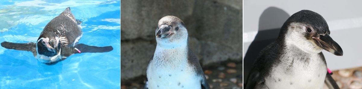 胸に1本の細いラインがあって、嘴は黒く、グレーの棒状の模様がある「ケープペンギン」の「なつ」(左)、「あき」(中)、「つば」(右)。個性豊かなペンギンたちとは冬限定の「ウィンターペンギンパレード」で会うことができます。