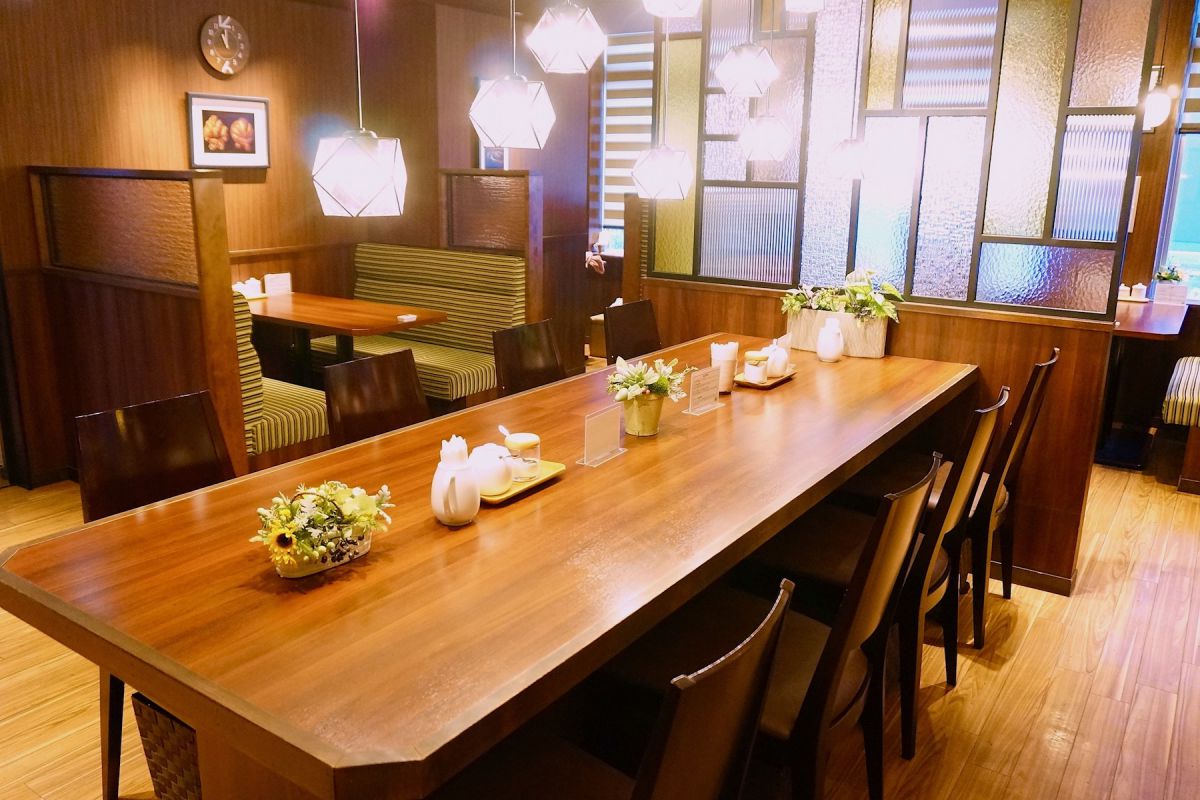お店に入ると、駅前の喧騒が嘘のように、とても落ち着きのある空間が広がっています。木を基調とした内装に、温かみのあるライトが印象的。