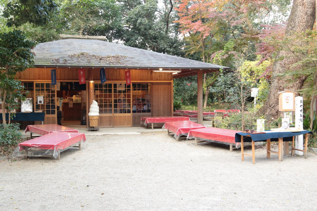 清々しい空気に包まれる参道の先、下鴨神社の楼門に入る鳥居の手前にあるのが『休憩処さるや』です。鳥居の先には、縁結びの神様で有名な「相生社」もあります。