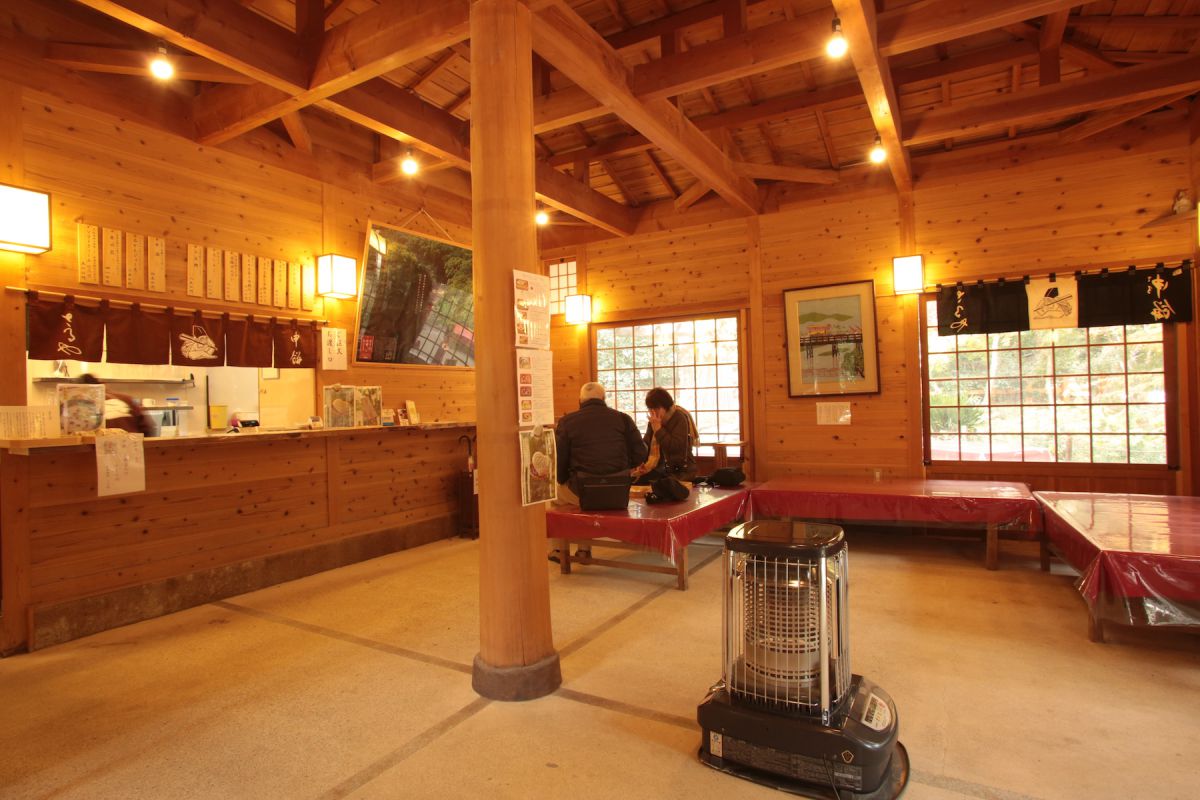 鳥の鳴き声と、木の実が落ちる、ぽたんという音だけが響く平日の朝の静かな境内。 休憩処の中に入れば天井は高く、冬の寒い日はストーブで暖かく、とても居心地のよい空間が広がっています。