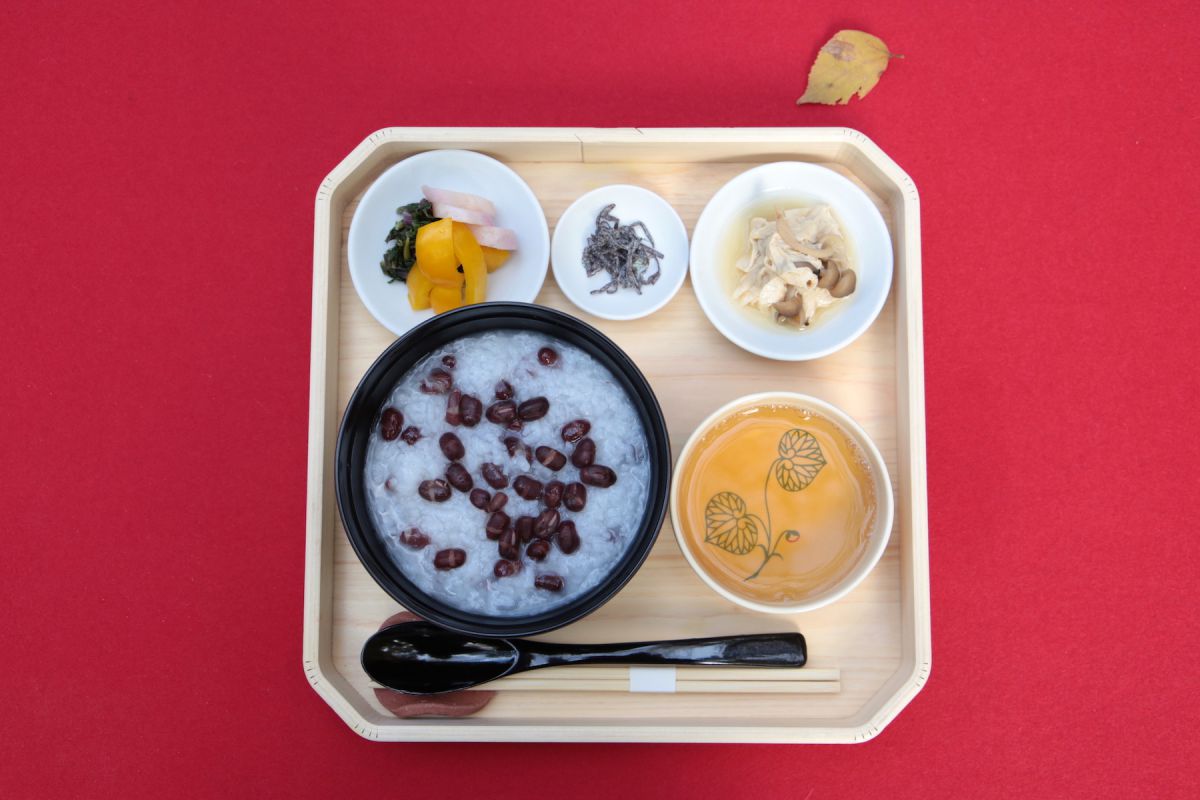 このふっくらとした大納言小豆の粒とぬめりのある粥の米。ほんのすこしの塩っけだけが味付けで、あとは小豆、米の素材のよさがじんわり伝わってくる滋味溢れる味わい。 小豆もお米も神社へ献上されているものと同じ生産者から仕入れた最高級のものを、御神水で炊かれています。