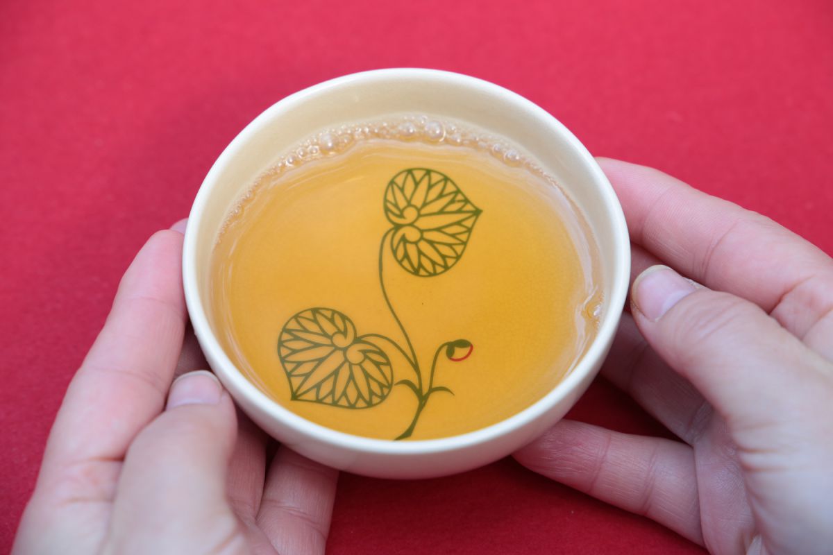下鴨神社の御神紋、双葉葵(ふたばあおい)の映るほうじ茶。こちらのほうじ茶は宝泉堂のお家でも代々飲まれている茶葉で丁寧にいれられています。ひとあじ違う美味しさは、一口飲めばわかるはず!