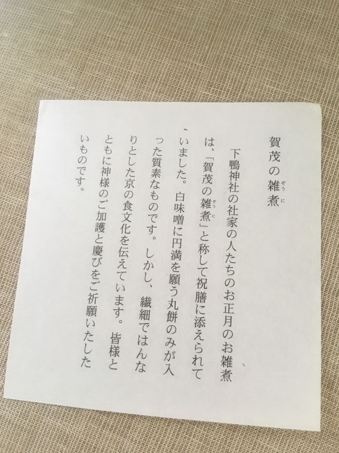 初詣に行列覚悟でいただきたいのが、1月1日〜3日の3日間限定、1000食限定のお雑煮。下鴨神社の社家の御正月の祝膳のお雑煮と同じ、白味噌のおだしに丸餅が入っただけのシンプルなもの。毎年、この味を求めていらっしゃる常連さんや冷えたカラダを温めようと注文されるお客さんで賑わい、2日目に売り切れることもあるほどの人気だそう。
