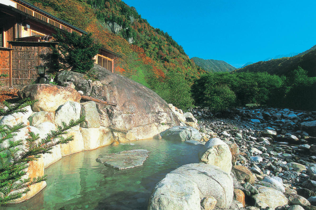 新穂高温泉で、鎌田川沿いにある混浴露天や貸切露天、女性専用露天など7つの露天風呂が人気の宿「槍見の湯 槍見舘」。