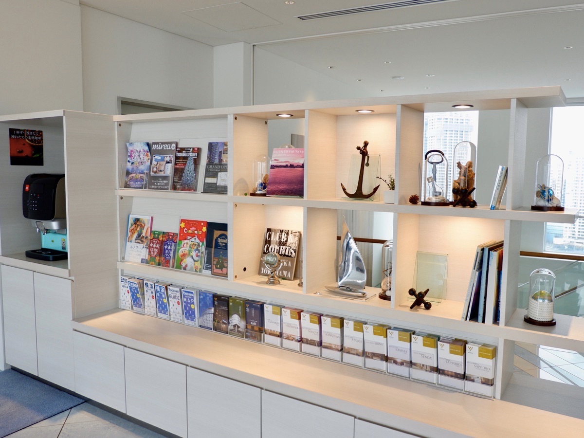 フロントの床には羅針盤をモチーフにした模様、棚にはヨットや錨などのオブジェも。みなとみらいのガイドブックやフリーペーパーも用意されており、観光の情報収集にも役立ちそうです。