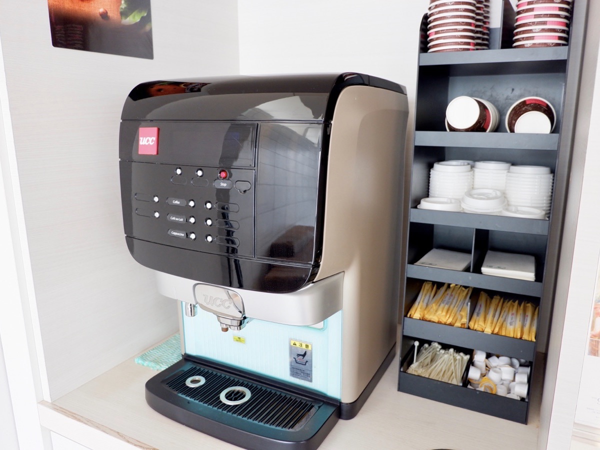 コーヒーメーカーも用意されており、コーヒーやカフェラテなどが自由に飲めます。フロントのソファーで飲むだけでなく、客室に持ち帰って飲むこともできますよ。