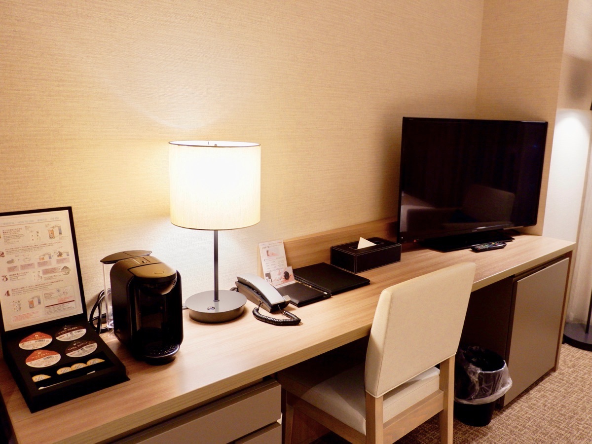 デスクには18階の高層階のみに置かれるUCCのコーヒーマシン、液晶テレビ、電話などが揃えられています。大きめのデスクなので、パソコン作業をしたり簡単な食事をしたりと、さまざまな用途で使えそうです。