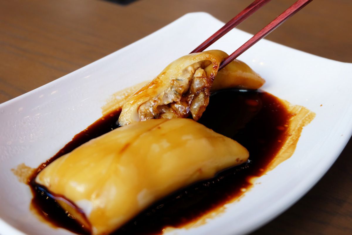 台湾で人気の中華クレープ、「海老腸粉(チョウファン)」(338円+税)。もっちりとした米粉を使用しており、中は海鮮などの具材をギュッと閉じ込めています。