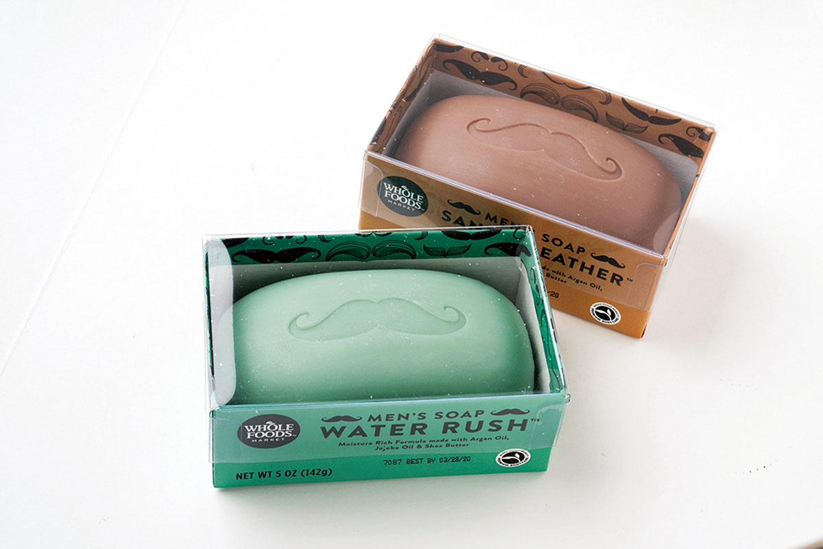 ホールフーズのオリジナル。ひげが目印のメンズソープ各$4.99。