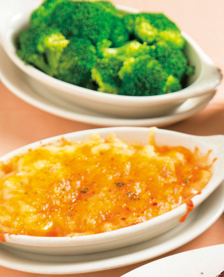 付け合わせもご紹介。おすすめはチーズたっぷりのポテトグラタンやスチーム・ブロッコリー各$11。