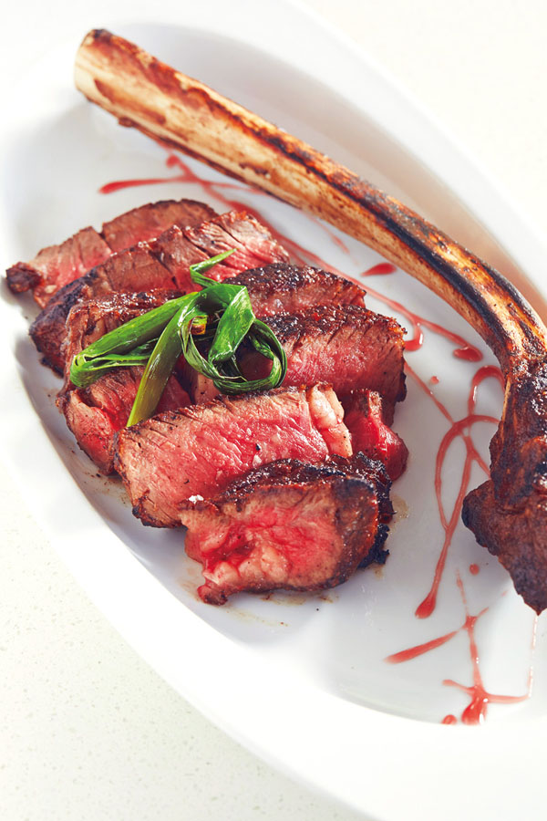 熟成トマホーク $ 205(約1021g、 2人分)は45日間熟成のプライムブラックアンガスビーフを使ったぜいたくな一品。