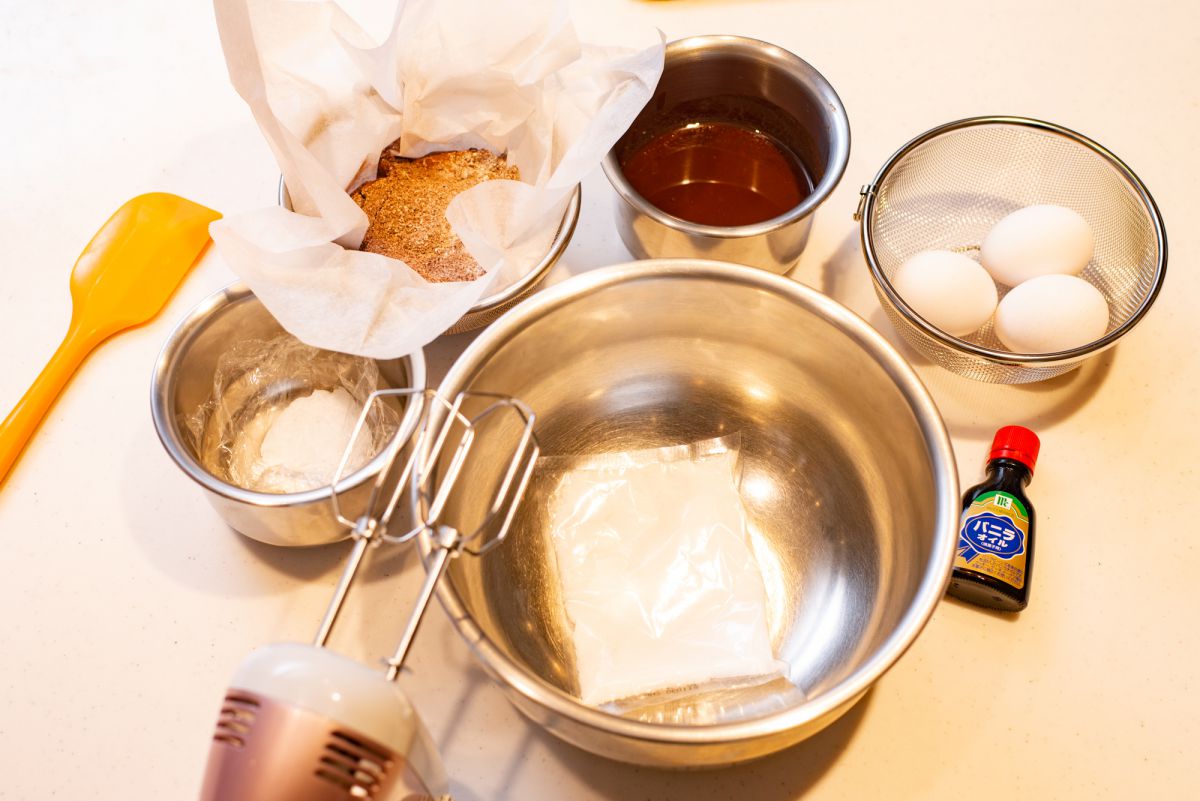 続いて、ブラウニーの生地作りにチャレンジ。ボールに卵2つと卵黄1つを入れ、ハンドミキサーでほぐします。