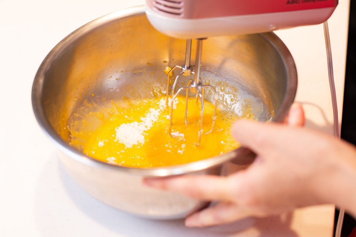 寺田先生「卵がほぐれたら砂糖を入れて、全体がマヨネーズのような色合いになるまで、ハンドミキサーで混ぜましょう」