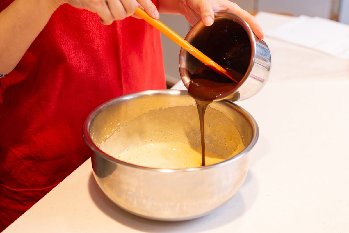 寺田先生「チョコレートとバターを湯煎で溶かすと、熱々になってしまうことがあります。そのまま卵と合わせると卵が固まってしまうので、必ず冷ましましょう」