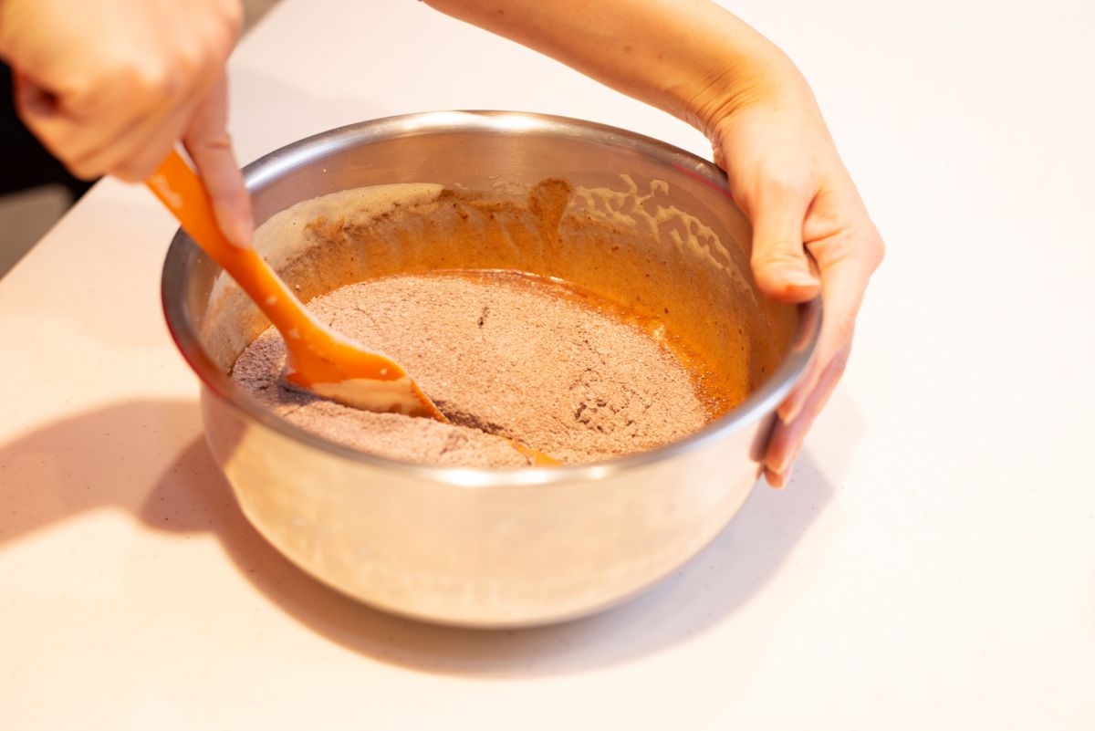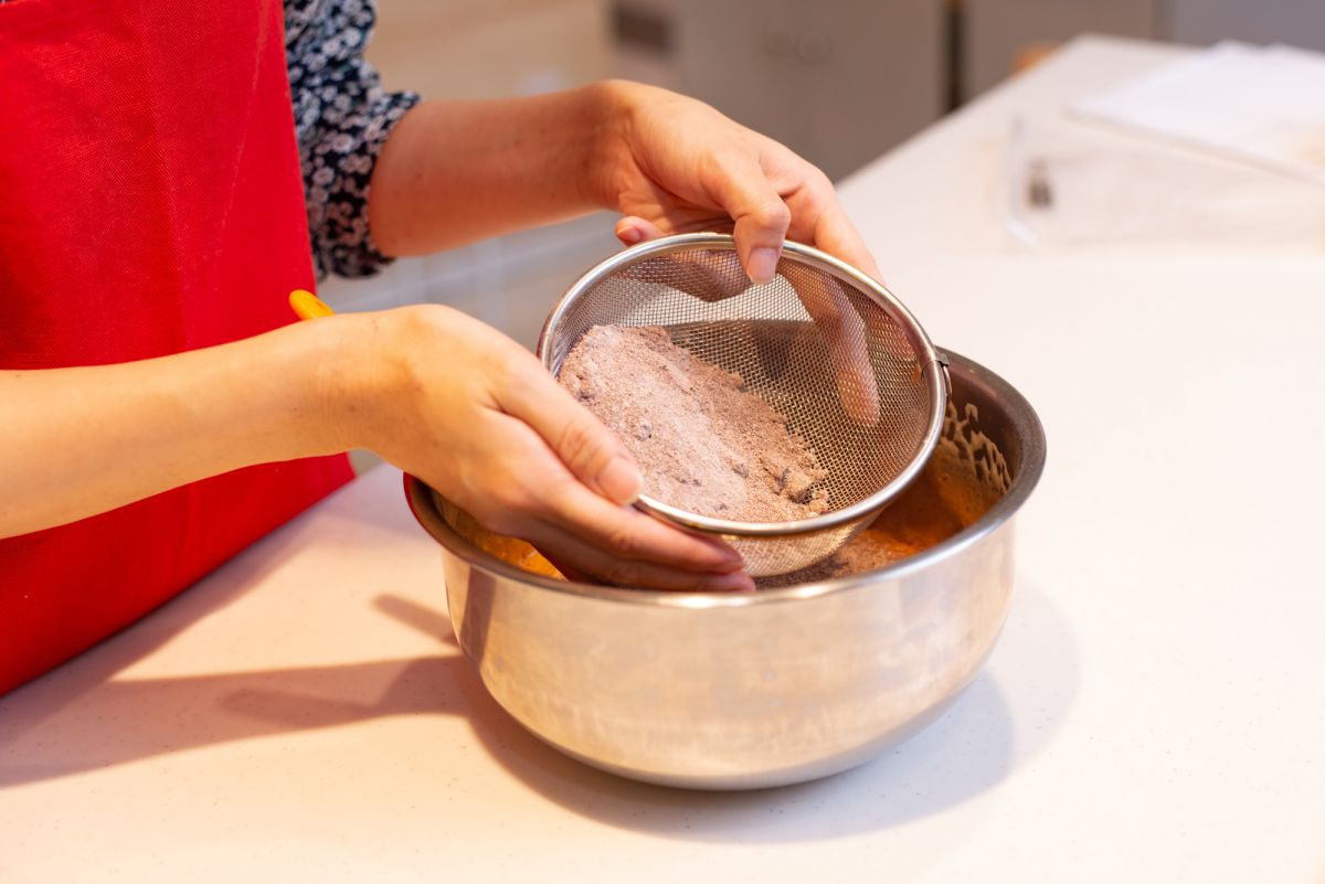 寺田先生「生地に粉をふるい入れる前に、粉を3回、ふるいにかけています。実は、複数の粉を合わせて使う時は、粉の種類数と同じ数だけふるいにかけると、生地がなめらかに仕上がります。今回は、薄力粉とココアパウダー、アーモンドパウダーの3種類を合わせたので、3回ふるいにかけました」