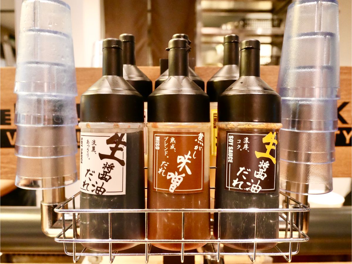 6種類もある焼肉のたれも席に常備。好きなたれを好きなだけどうぞ。
